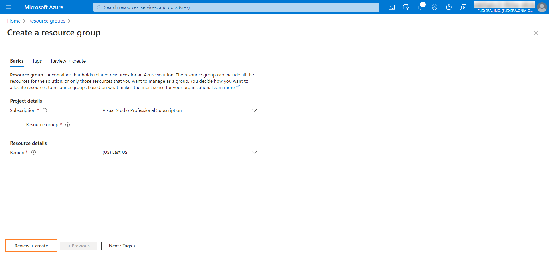 Field Description Subscription This field is pre-populated with the subscription. If required, you can select the required subscription from the drop down list. This is a mandatory field. Resource group This field is pre-populated with the resource group. If required you can add a new resource group by clicking on Create newlink. For more information, see Create Resource Groups. This is a mandatory field.Region This field is pre-populated with the region. If required you can select the desired region from the drop down list. This is a mandatory field. -