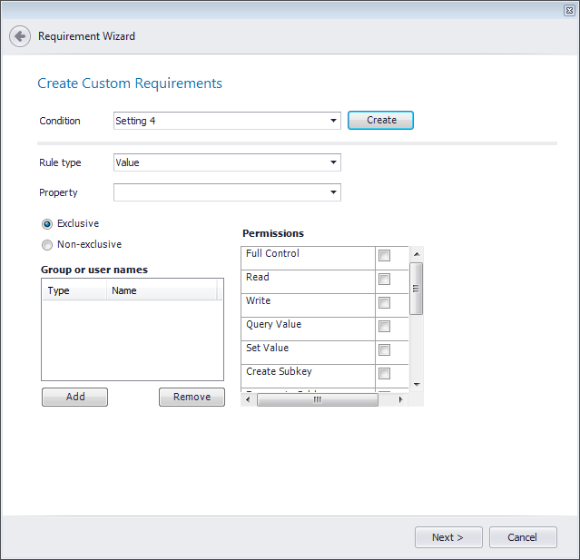 | Group or user names | Click Add to add users or groups to this list. On the Enter User or Group Name dialog box, you enter the name of the user or group using the format Domain\\User or Domain\\Group , and specify whether you want to Allow or Deny access to this user or group. Only displayed for global conditions with a Setting Type of Registry key that also have a Rule type of Value . |