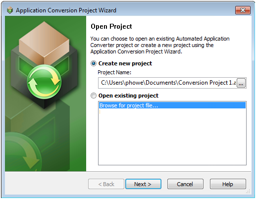 Launch Automated Application Converter. The Open Project dialog box opens.