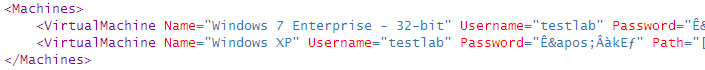 | Machines | The <Machines> element contains multiple <VirtualMachine> elements, which identify the virtual machines that you have added to the project:![]() |