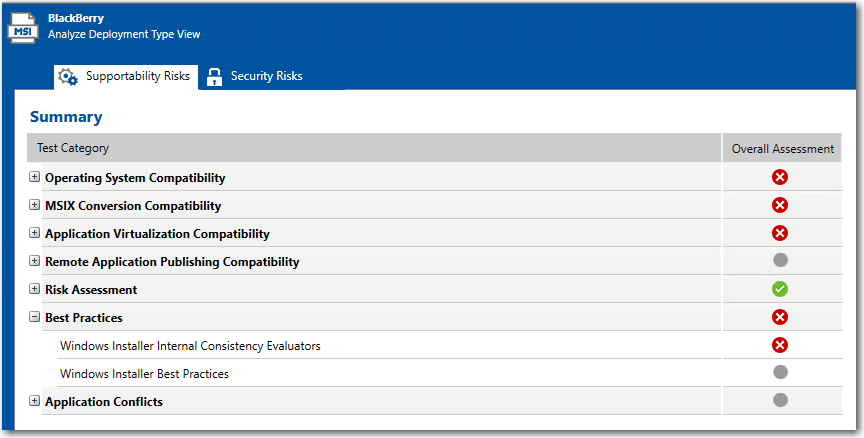 The Best Practices tab of the Analyze Deployment Type View lists all of the individual errors and warnings that were generated by tests in the Best Practices test group for the package.