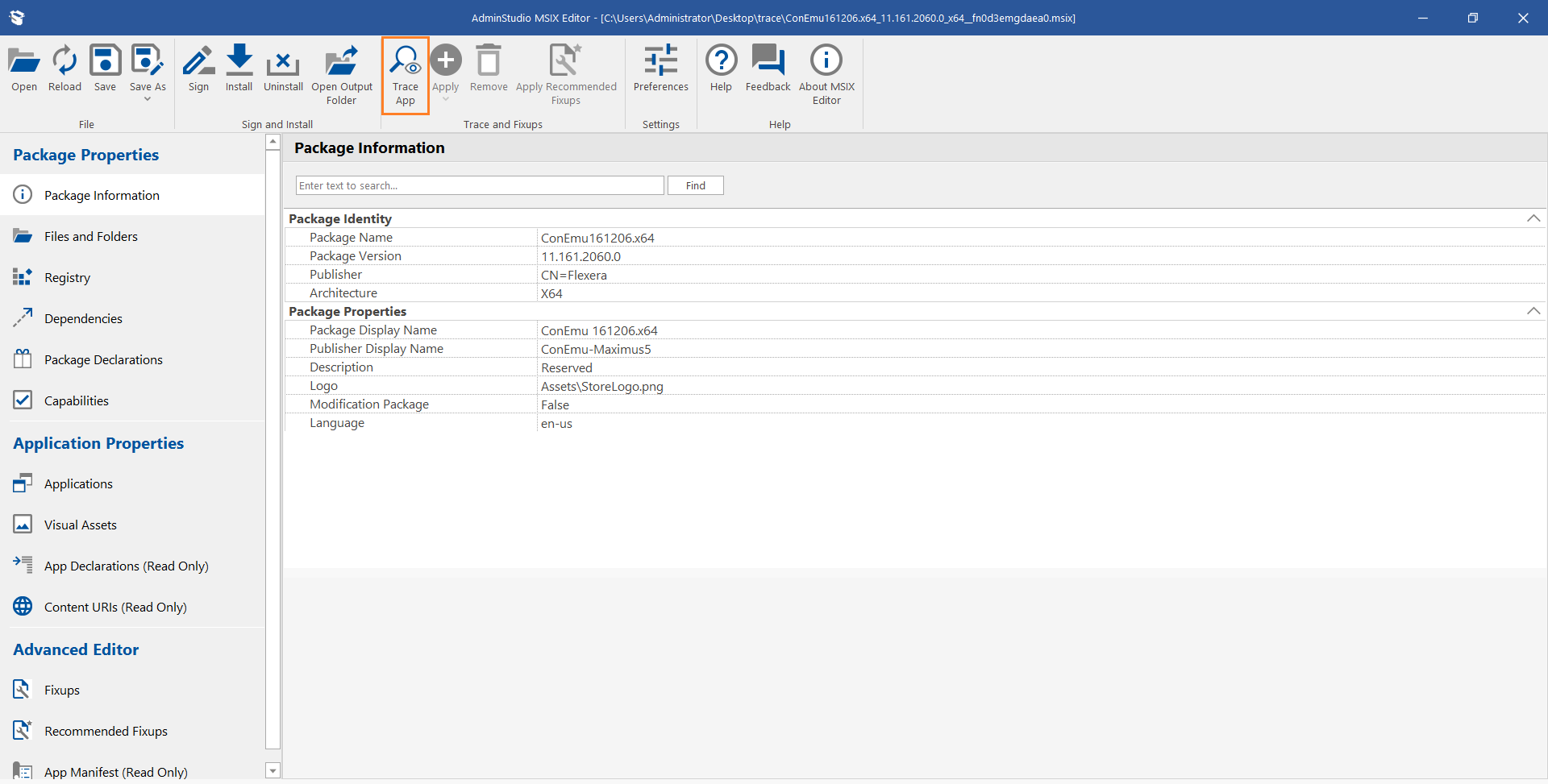 Click on the Trace App button in MSIX Editor ribbon.
